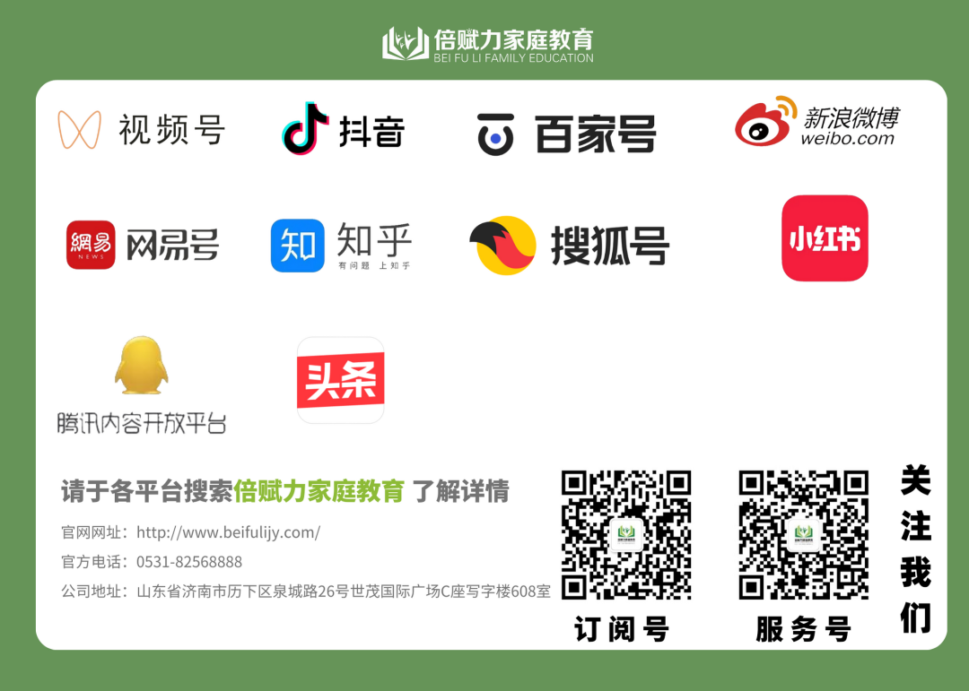 倍赋力家庭教育拥有专业的青少年问题教育专家、心理辅导专家、学习动力提升专家,每位老师均持证上岗,更有从业三十余年的心理学大拿、教授共同指导。已经为53000+家庭的家庭教育问题和青少年心理健康问题提供了专业化、定制化的咨询服务,并拥有成熟、完善的家庭教育指导体系。
