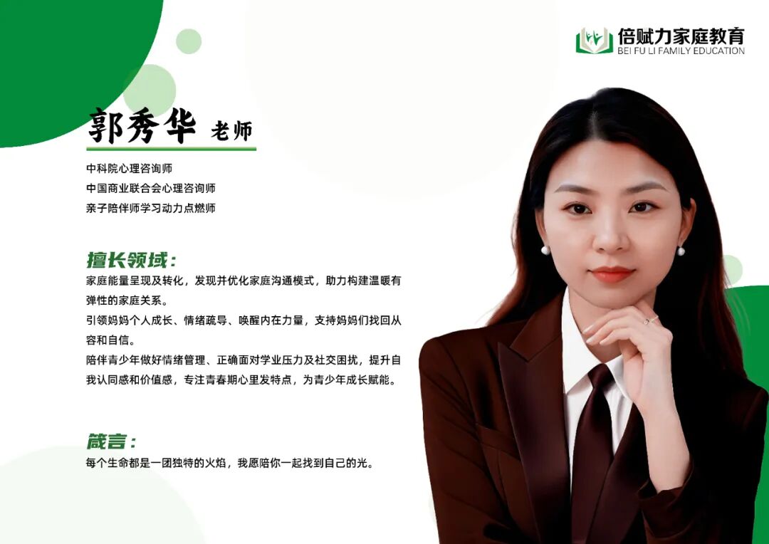 今天的名师专访为大家请到的是倍赋力家庭教育亲子专家部督导专家郭秀华老师。