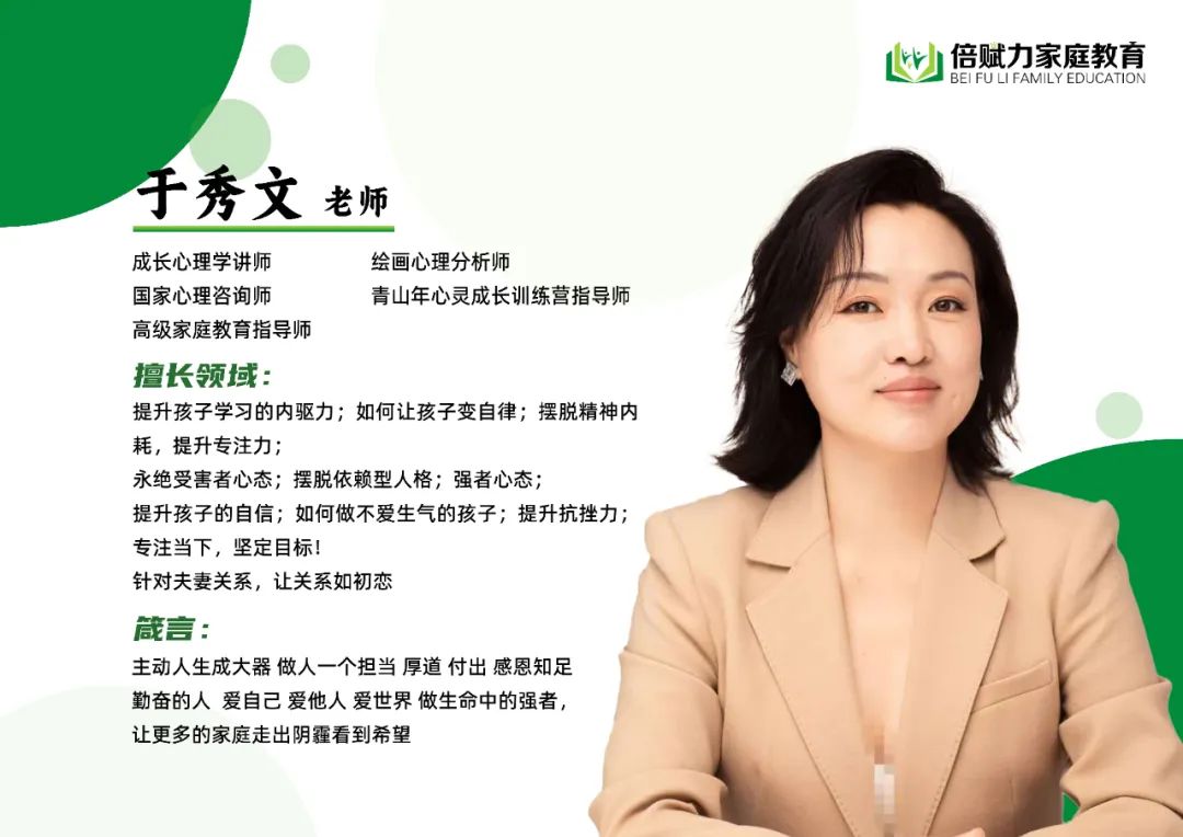大家好,我的倍赋力家庭教育亲子专家部的于秀文,一名心理老师、家庭教育指导师,同时也是一名婚姻情感指导师和青少年训练营导师。