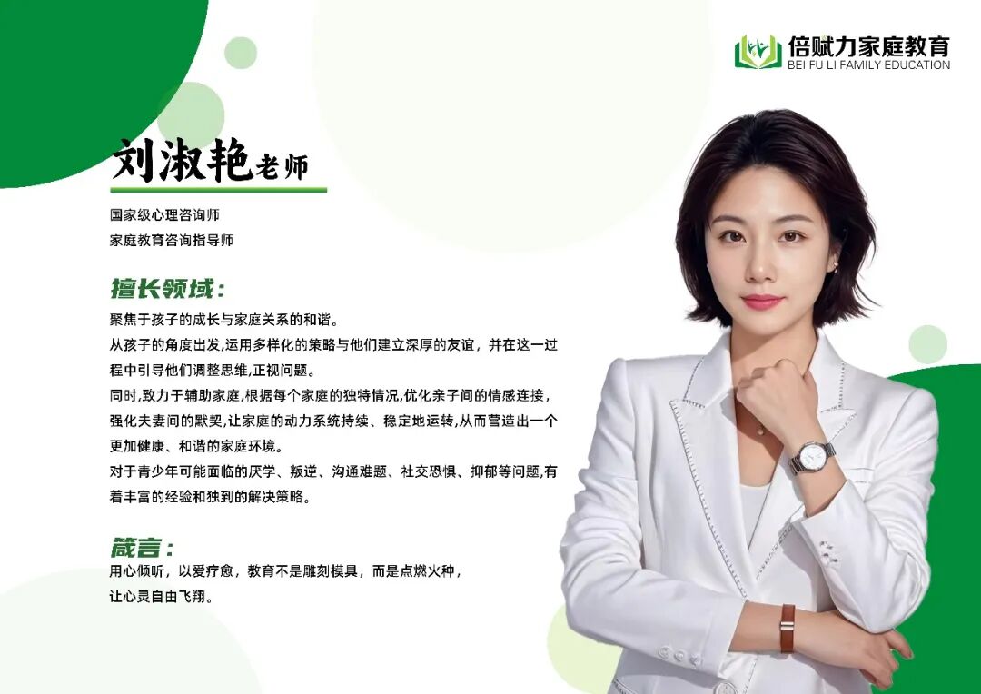 大家好,我是倍赋力家庭教育亲子专家部的刘淑艳老师,自2016年投身心理行业,我已经陪伴了成千上万的孩子与家庭一路走过成长的迷茫,解开了内心困顿,见证过无数次自我觉醒与家庭和解。